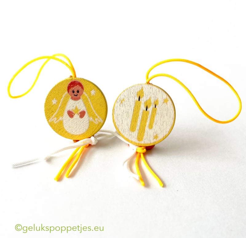 Geluksengeltje met kaarsjes, een eigen ontwerp gelukspoppetje van ongeveer 25 mm doorsnee. Op een kant van het gelukshangertje staat een geluksengeltje en op de andere kant van het gelukshangertje staan 3 kaarsjes afgebeeld.