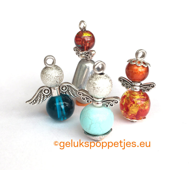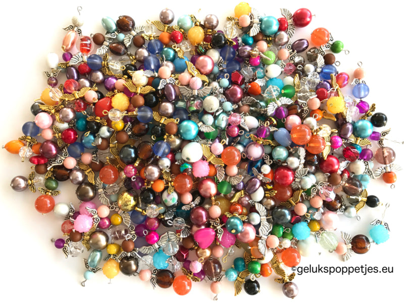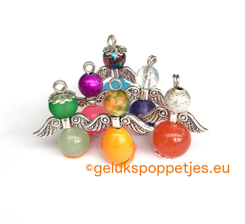 Geluksengeltjes gemaakt van allerlei soorten kralen en komen met goudkleur, acryl of zilverkleur vleugeltjes. Deze materialen worden door elkaar gebruikt. Elk geluksengeltje is handgemaakt en er is er dus niet 1 precies hetzelfde. De geluksengeltjes worden gemaakt door mensen met een beperking of chronische psychische problemen. Zij maken deze geluksengeltjes met heel veel plezier.