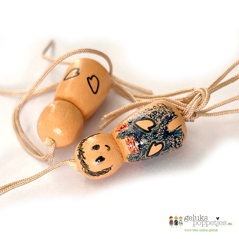 Gemaakt van FSC hout en met alleen maar ons eigen kenmerk "de handjes" op het gelukspoppetje. Deze houten gelukspoppetjes kun je evt dus nog zelf met een watervaste stift verder een tekening geven, bv een eigen gezichtje of leuke kleertjes.