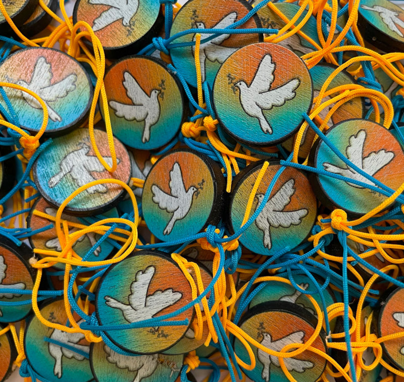 Vredesduif gelukspoppetje, een uniek gelukspoppetje van ongeveer 24 mm doorsnee.