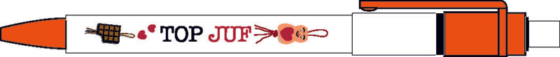Gelukspoppetjes pen voor je topjuf! Een fijne blauw schrijvende pen met daarop de afbeeldingen van het gelukspoppetje met het hartje op de buik en het chocolade gelukspoppetje.