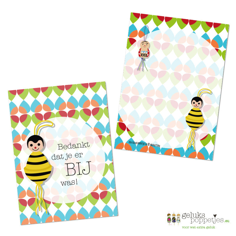 Dit gelukskaartje is ongeveer 10.5x7.4 cm en heeft de afbeeldingen van het gewone gelukspoppetje en het geluksbijtje. Erg leuk om deze er ook bij te geven, voor net dat kleine beetje meer geluk!
