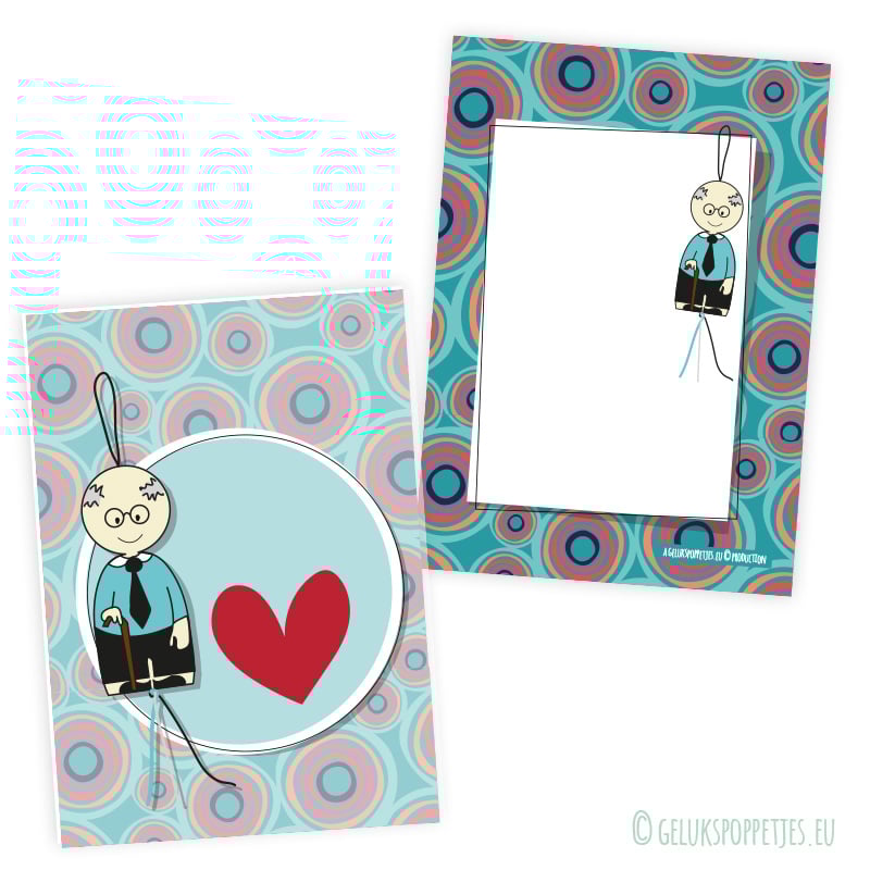 Hoe leuk om een kaartje te sturen met de afbeelding van ons opa gelukspoppetje erop. Nog leuker wordt het natuurlijk als je er een echt houten gelukspoppetje opa bij geeft!