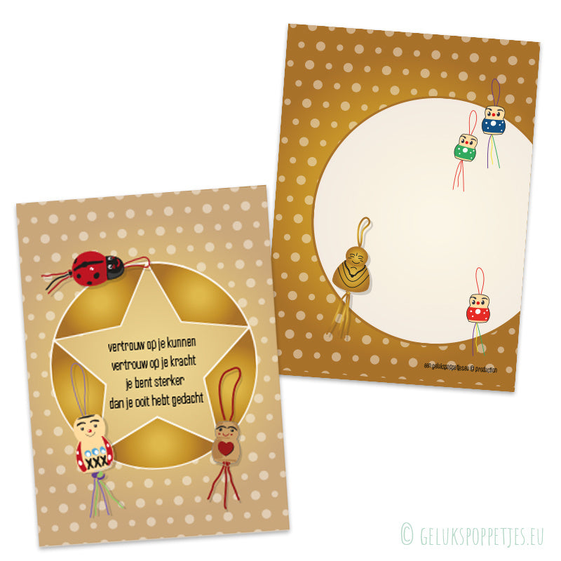 Dit gelukspoppetjes kaartje is er eentje om iemand een hart onder de riem te steken, om te laten weten dat je in iemand gelooft en dat je iemand een beetje vertrouwen geeft.