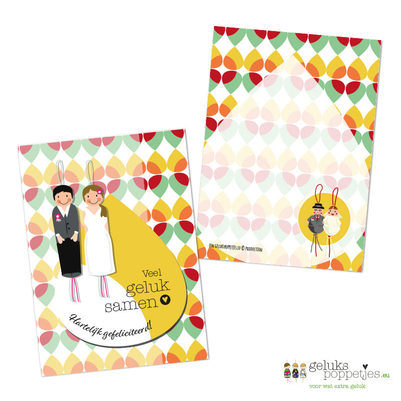 Gelukspoppetjes kaartje voor een lief bruidspaar man/vrouw. De andere kaartjes kunnen we op verzoek evt laten drukken.