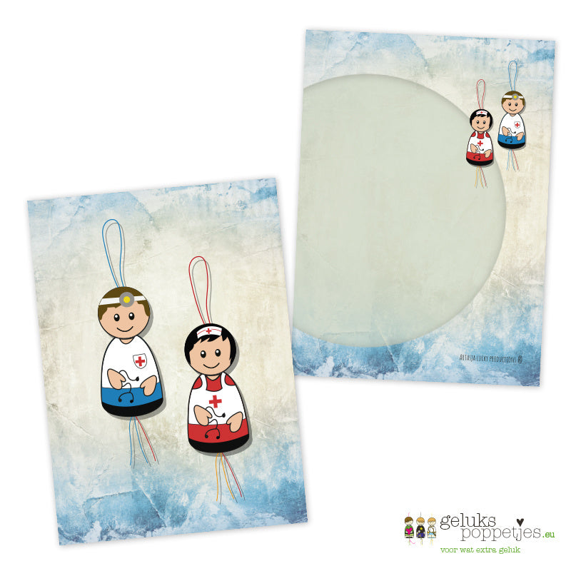 Mooi kaartje met de gelukspoppetjes van het verplegend personeel erop afgebeeld. De geluksdokter en verpleegkundige, zuster of verpleegster. Het ziekenhuispersoneel zal het erg leuk vinden dat er een kaartje is om hen te bedanken, maar het is ook een leuk kaartje voor een zieke met de boodschap dat de dokter en zuster goed voor de zieke moet zorgen.