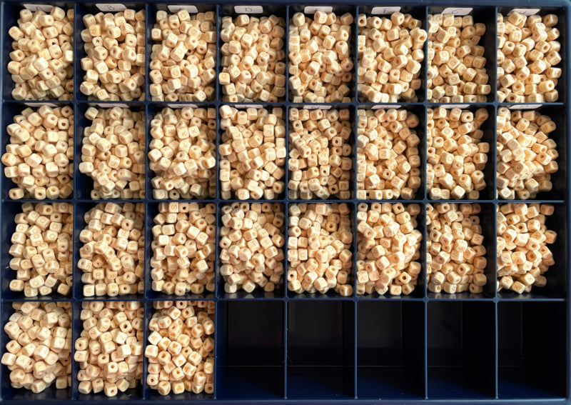 Houten letterkralen gemaakt van FSC hout. Deze houten letterkralen zijn ongeveer 6x6 mm en hebben een rijg gat van 1 mm. Deze houten letterkralen worden speciaal gemaakt voor Artasja Lucky Productions®, een bedrijf dat duurzaam hoog in het vaandel heeft.